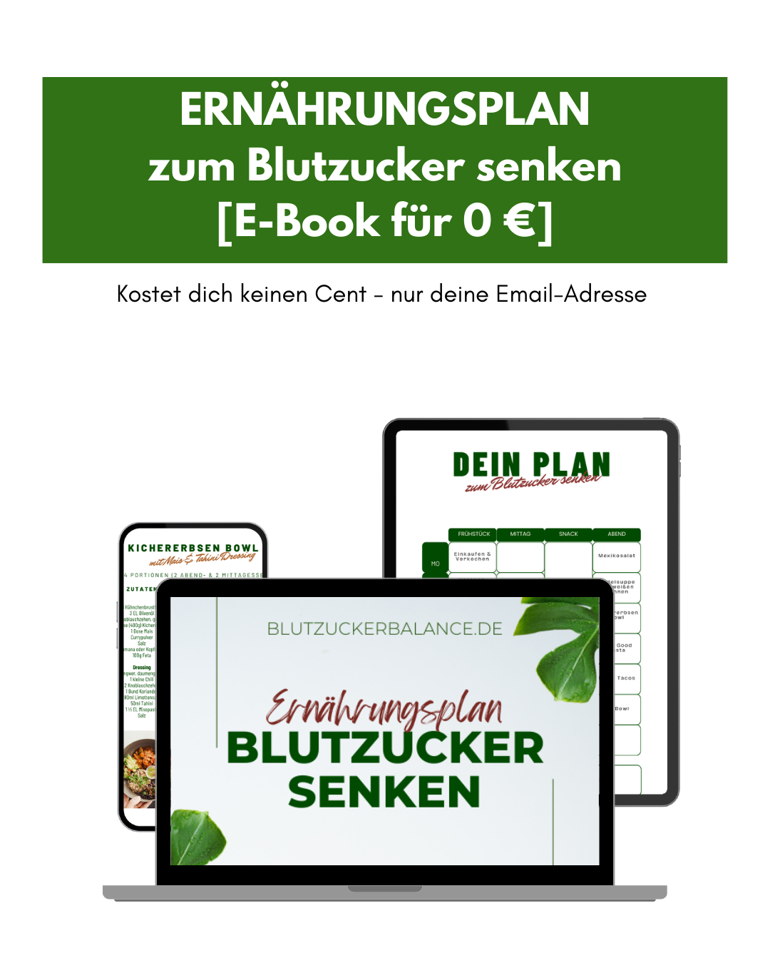 Und wenn du immer noch nicht sicher bist, was du jetzt noch essen kannst: Unser Ernährungsplan Blutzucker senken gibt dir einen Einblick, wie du Gerichte blutzuckerfreundlich zusammenstellst. Darin findest du einen Plan für volle 5 Tage inklusive Rezepte, Einkaufsliste und Meal Prep Tipps.